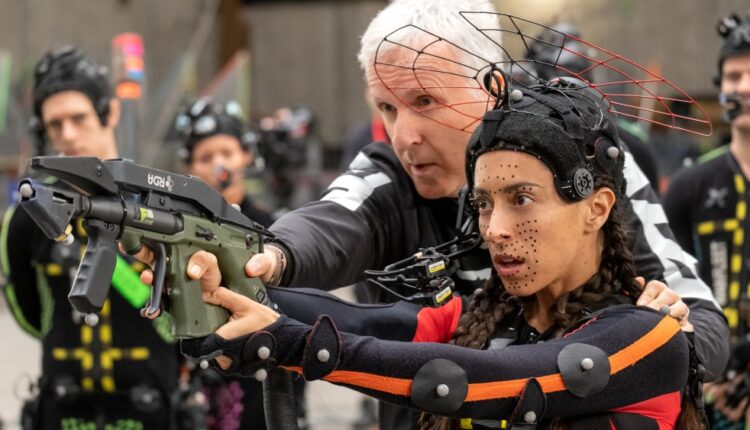 James Cameron (right) directing Zoe Saldaña and Sam Worthington on the set of “Avatar: Fire and Ash.”
