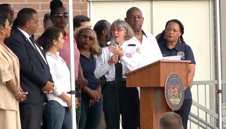 New Orleans Police Department Superintendent Anne Kirkpatrick, center, speaks at the Night Out Against Crime event on Oct. 21, 2025.