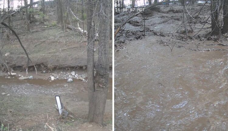 Images from the U.S. Geological Survey posted to the Albuquerque NWS social media account show a river in Lincoln County, the Rio Ruidoso, rapidly rising 15 feet in about an hour. “Stay away from the river! Seek higher ground NOW!” the weather service wrote.